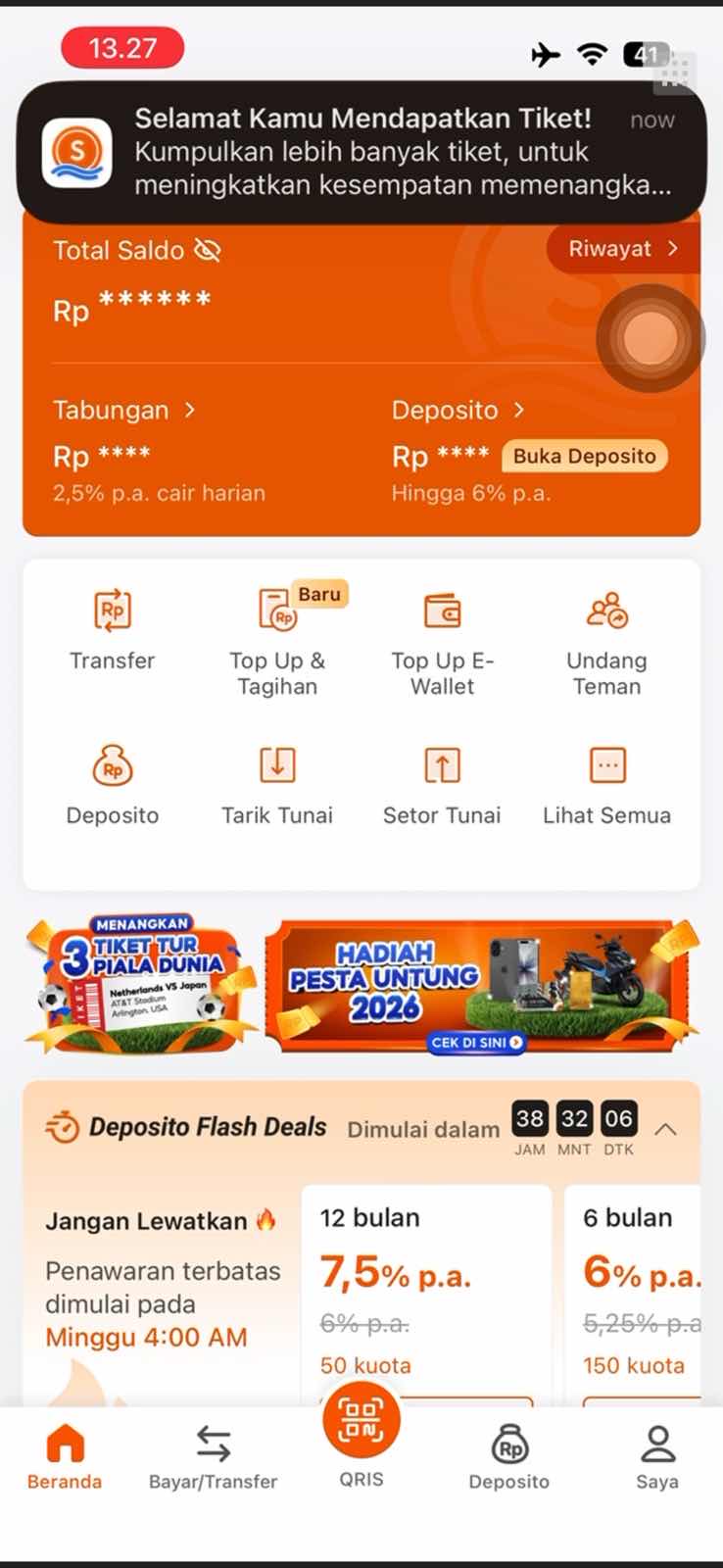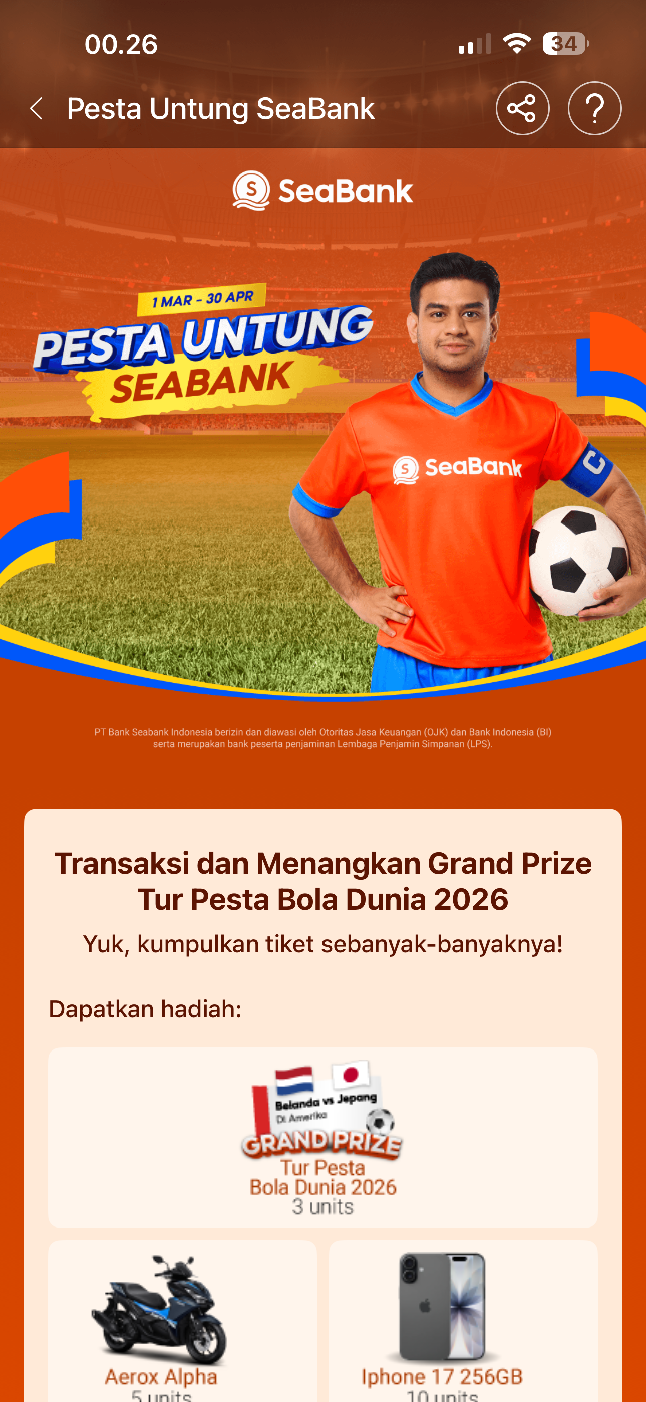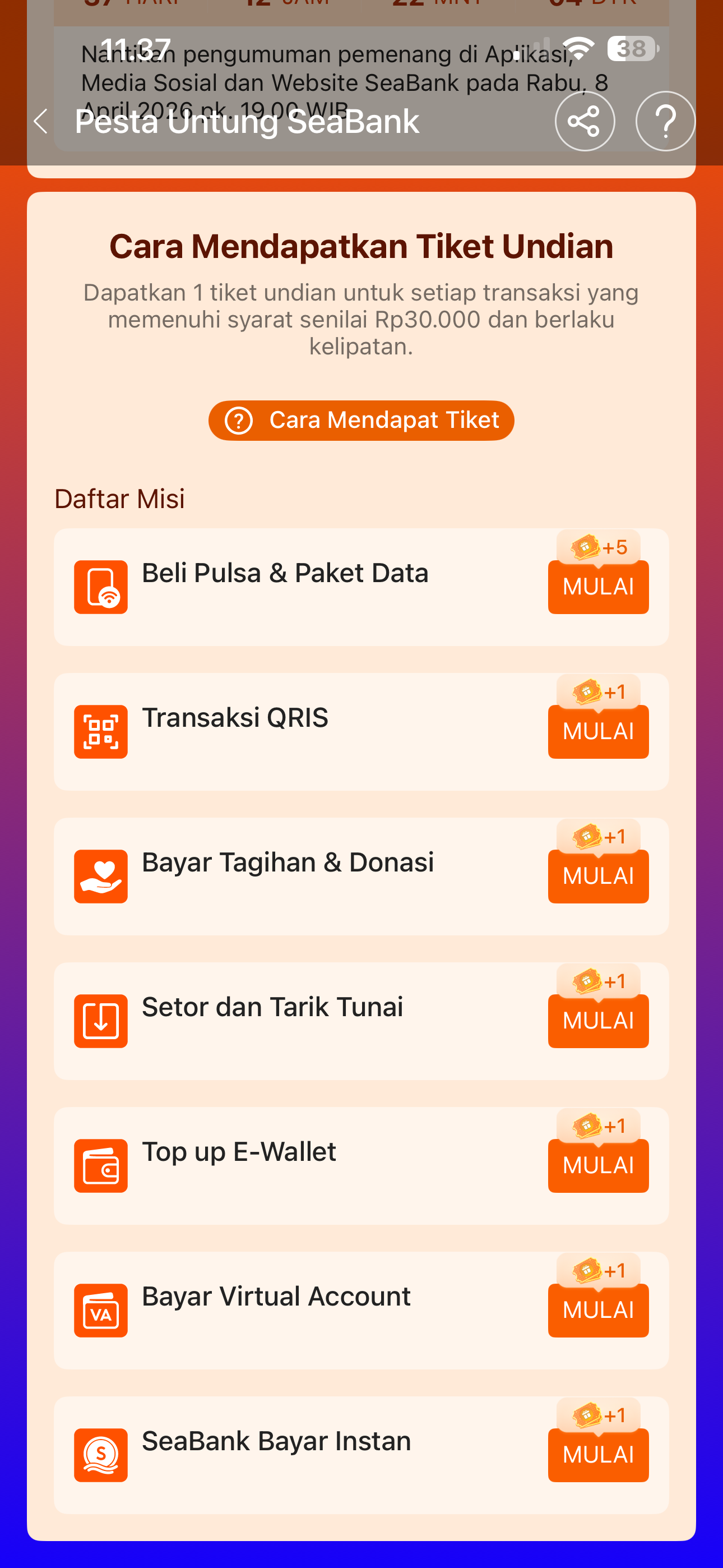 - Jumlah tiket yang Nasabah kumpulkan dapat dilihat di aplikasi SeaBank pada menu utama > Pesta Untung SeaBank 2026